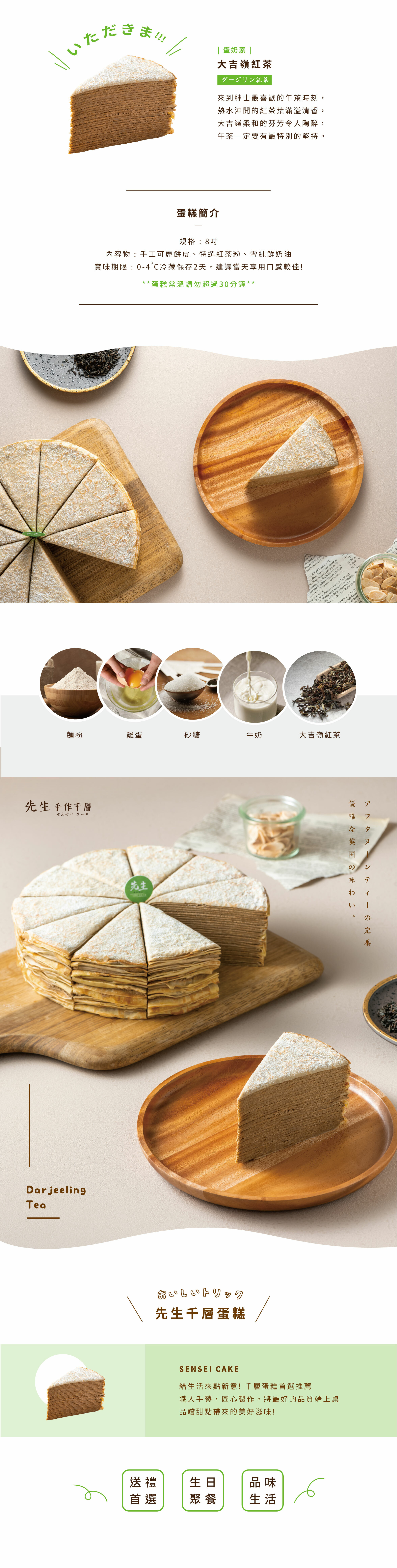 ❝以茶中香檳聞名的大吉嶺紅茶,與綿密的鮮奶油攪拌在一起,讓甘雅柔潤的香氣融入手製可麗餅皮中,優雅的英式風味,是下午茶的經典之最。❞